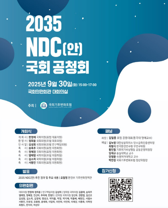 30일 공청회에서는 오일영 환경부 기후변화정책관이 ‘2035 NDC(안) 추진 경과 및 주요 내용’을 발표할 예정이다. 이어 김일중 국회기후변화포럼 공동대표(동국대 명예교수)가 좌장을 맡아 토론이 진행된다. 김녹영 대한상공회의소 탄소감축인증센터장, 최형식 한국환경연구원 부연구위원, 황인철 기후위기비상행동 공동운영위원장, 임재규 숭실대 교수, 안영환 숙명여대 교수, 박연정 국회기후변화포럼 청년위원장이 토론에 참여할 예정이다.