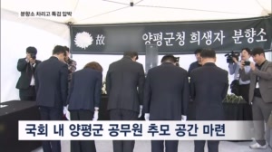 【 앵커멘트 】 국민의힘은 국회 안에 양평군 공무원을 추모하는 분향소를 차리고 단체로 조문하며 압박을 이어갔습니다. 장동혁 대표는 "민중기 특별검사를 반드시 국감장에 세우겠다"고 밝히면서 '폭력수사 특검법'을 제출했습니다. 이어서 정예린 기자입니다.【 기자 】 국민의힘 의원들이 국회 내 마련된 양평군 공무원 분향소로 향합니다. 차례로 헌화하고 단체로 고개를 숙여 묵념합니다. 장동혁 국민의힘 대표는 조문록에 '살인 특검의 진실을 반드시 밝히겠다'고 적었습니다. 김건희 여사 일가의 '양평 공흥지구 특혜 의혹' 관련 특검 수사를 받다가 숨진 채 발견된 양평군 공무원의 추모 공간을 국회 중앙 잔디밭에 마..