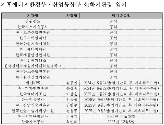 29일 이데일리가 공공기관 경영정보 공개시스템 ‘알리오’를 통해 조사한 결과, 기후에너지환경부와 산업통상부 산하 공공기관 19곳이 인사 대상인 것으로 나타났다. 현재 즉시 임명이 가능한 공석은 11곳, 기관장 임기(3년)가 만료된 곳은 6곳, 연내(11~12월)에 임기 만료 예정인 기관은 2곳이다. 기후부 산하기관은 9곳, 산업부 산하기관은 10곳이다.