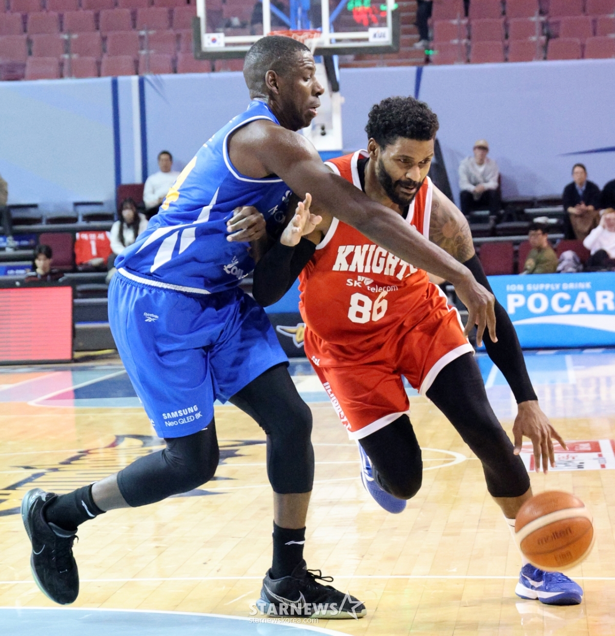 SK 먼로가 28일 잠실실내체육관에서 열린 2025-2026 LG전자 프로농구 삼성선더스와 SK나이츠 경기에서 니콜슨의 압박으로 받으며 돌파를 시도하고 있다. 2025.10.28.
