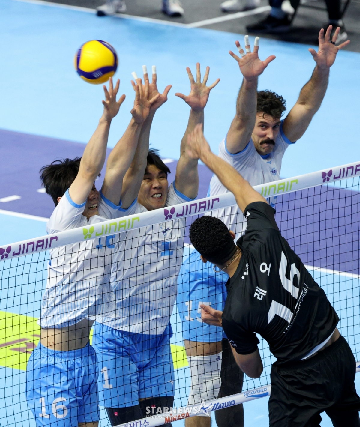 현대캐피탈 레오가 16일 계양체육관에서 열린 2025-2026 진에어 Vf리그 남자부 대한항공과 현대캐피탈의 경기에서 대한항공 삼중블로킹위로 강타를 터트리고 있다. 2025.12.16.