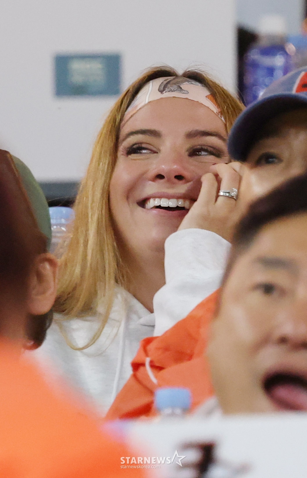 한화 선발 폰세가 역투하고 5회 투구를 마친 후 마운드에서 내려가자 만삭의 아내 엠마 폰세가 눈물을 흘리고 있다.