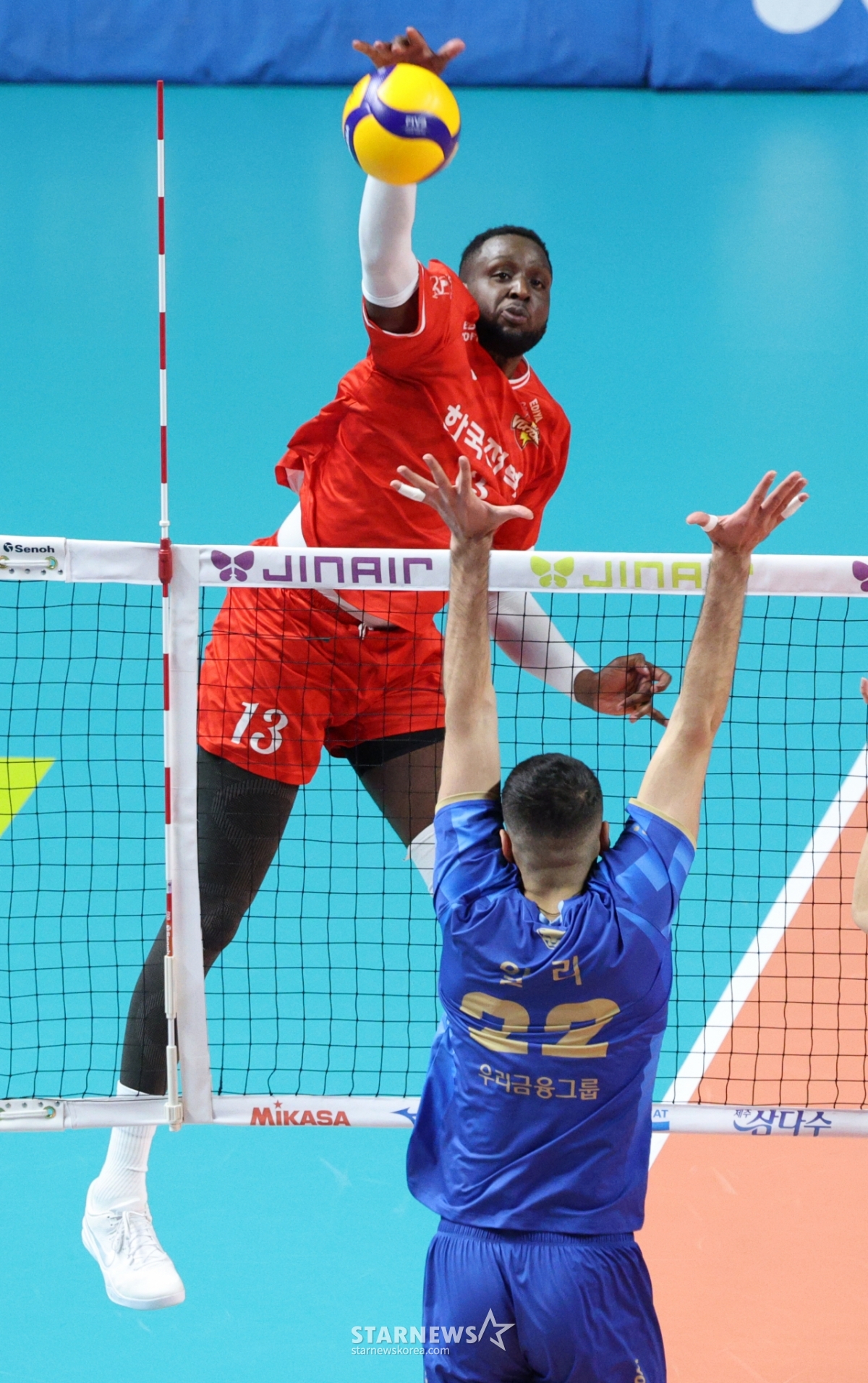 한국전력 베논이 우리카드 알리의 블로킹 위로 강스파이크를 날리고 있다.