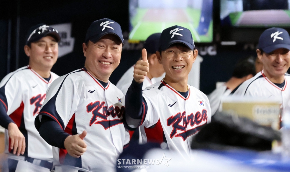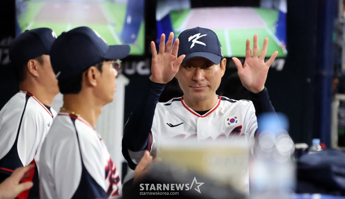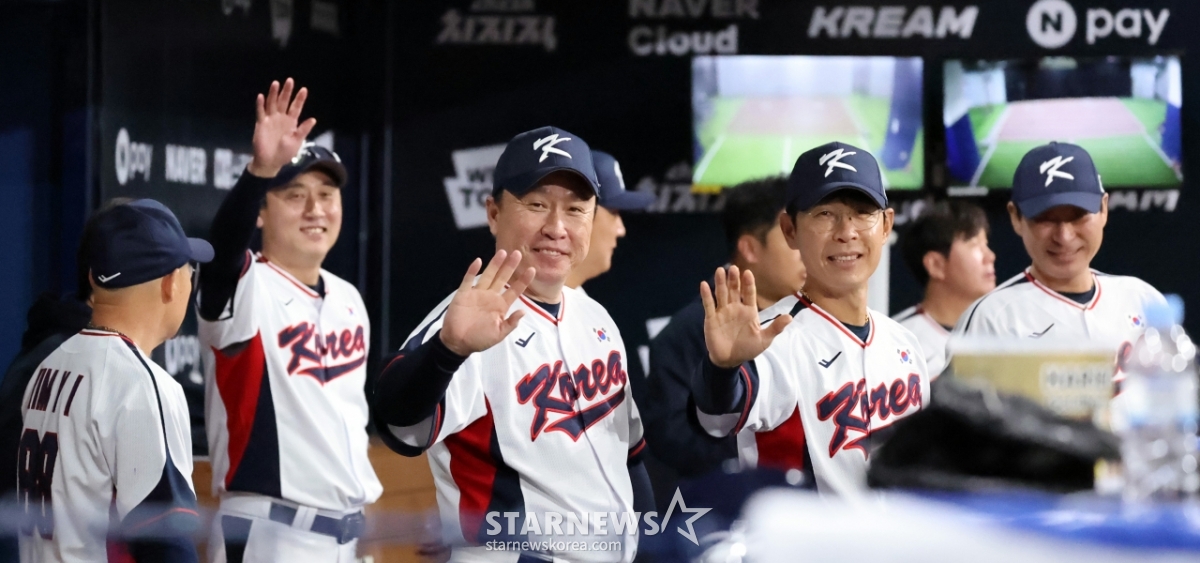 야구대표팀 이동욱, 강인권, 김재걸, 최원호 코치가 8일 오후 서울 고척스카이돔에서 열리는 ‘2025 NAVER K-BASEBALL SERIES’ 한국과 체코의 평가전에서 반갑게 손인사 를하고 있다. 2025.11.08.