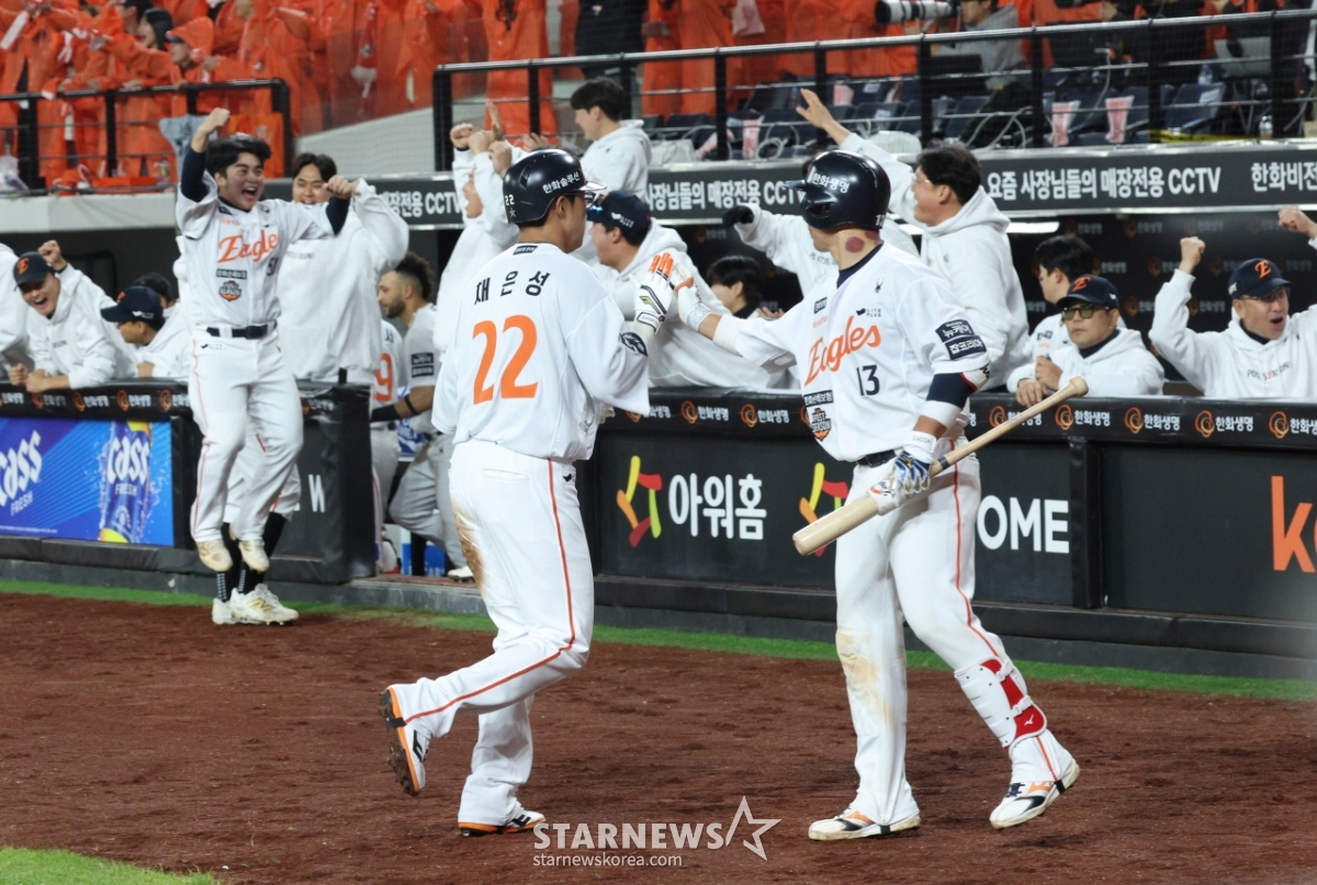 한화 3회말 2사 루에서 3루주자 채은성이 김태연의 내야땅볼 때 상대 실책으로 득점한 후 동료들의 환영을 받고 있다.
