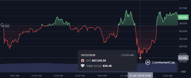 | 비트코인이 22일 새벽 8만7000달러대까지 하락했다가 현재 9만달러대 안팎을 기록하고 있다. (사진=코인마켓캡) |