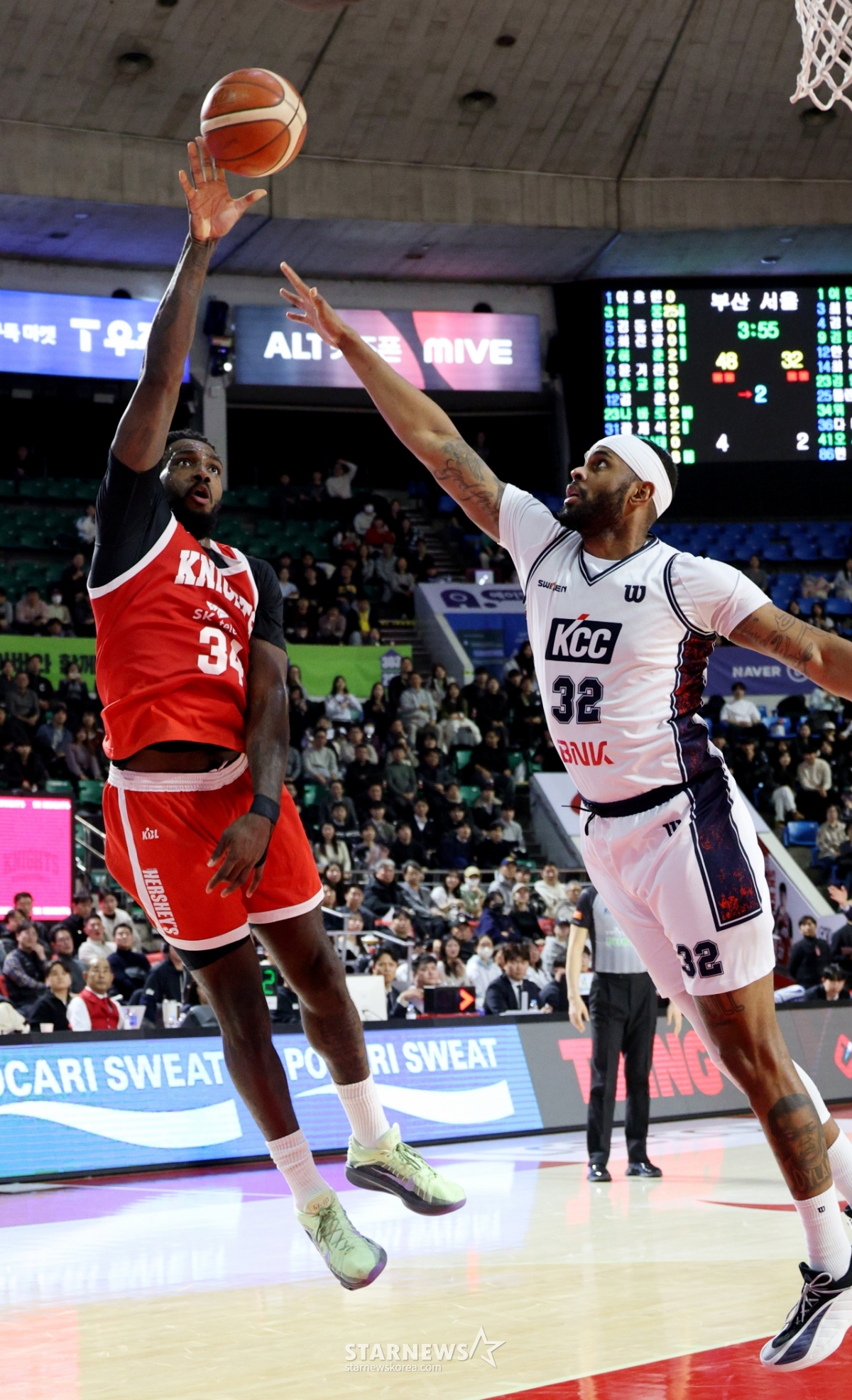 SK 워니가이 2일 실학생체육관에서 열린 2025-2026 LG전자 프로농구 서울SK와 부산KCC 경기에서 에르난데스를 피해 훅슛을 시도하고 있다. 2026.02.02.